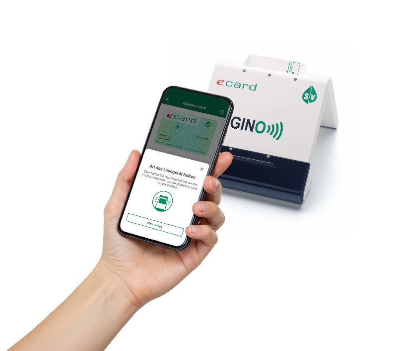 In den Apps der Sozialversicherung kann nach dem Login mit ID Austria auf einem NFC-fähigen Smartphone die digitale e‑card hinzugefügt und wie gewohnt am e-card Lesegerät (GINO) in einer Ordination oder Apotheke verwendet werden.